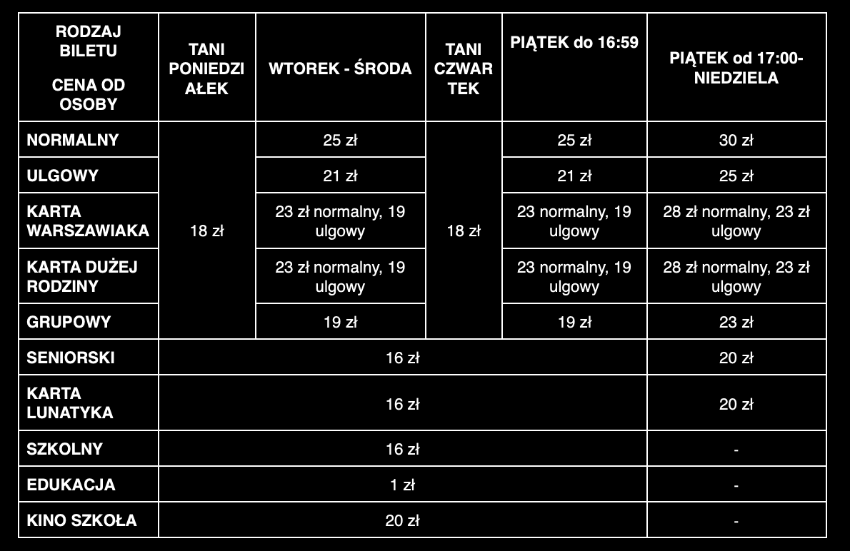 • Kino zastrzega sobie możliwość wprowadzenia odrębnego cennika na specjalne pokazy filmowe, cykle, przeglądy i festiwale.